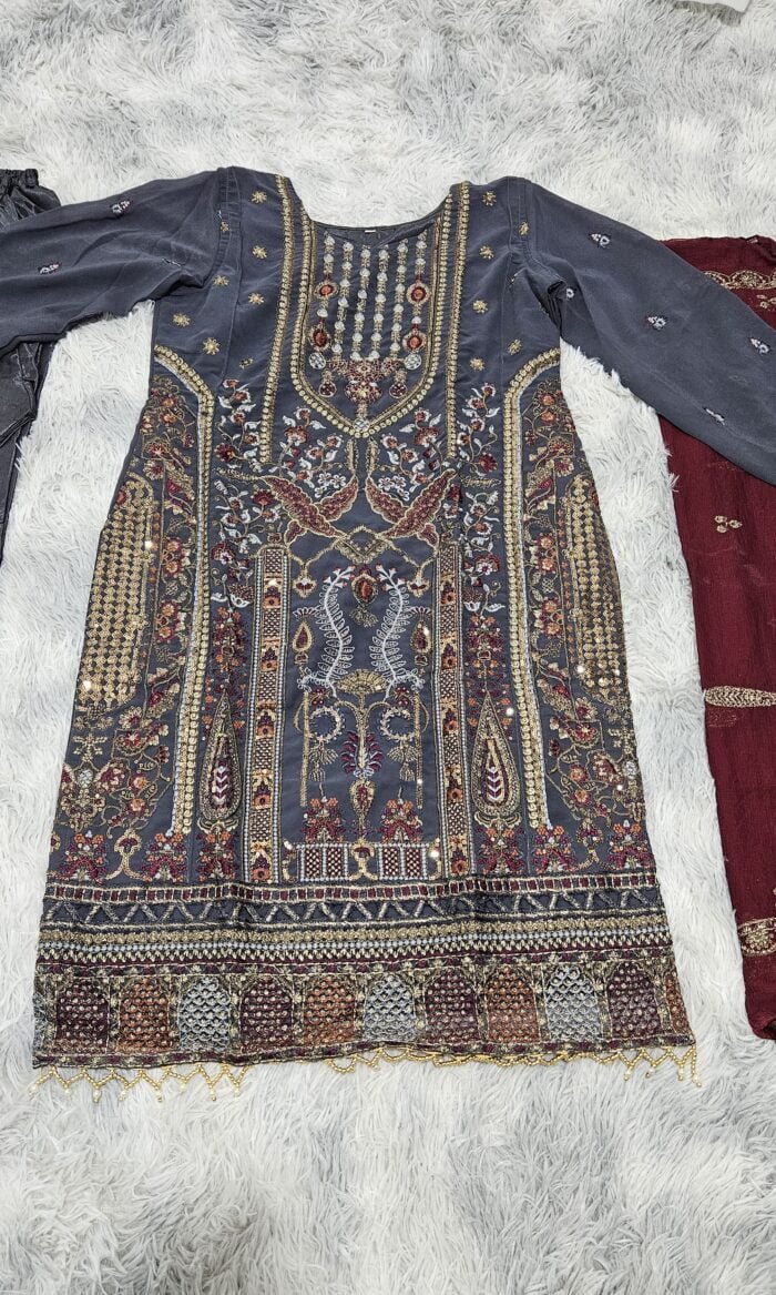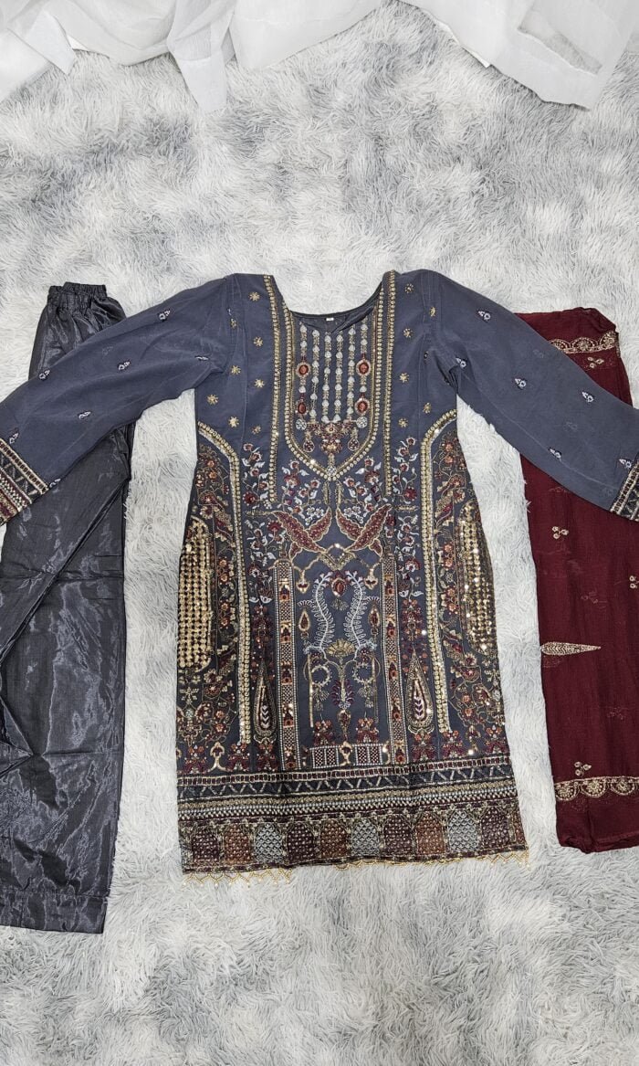 Fabric Description : Top – Heavy Georgette With Heavy Embroidery (3mm) Rainbow Sequence Work | Top Inner – Attach Heavy Santoon | Bottom Inner – Heavy Santoon | Dupatta: Heavy Georgette With Heavy Embroidery (3mm) Rainbow Sequence Work | Top Length – Max up to 48″