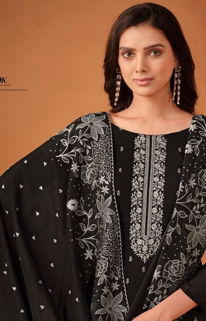 Fabric Description : Top: Soft georgette with embroidery, Bottom: Soft santoon, Dupatta: Soft silk jacquard with Swarovski.